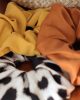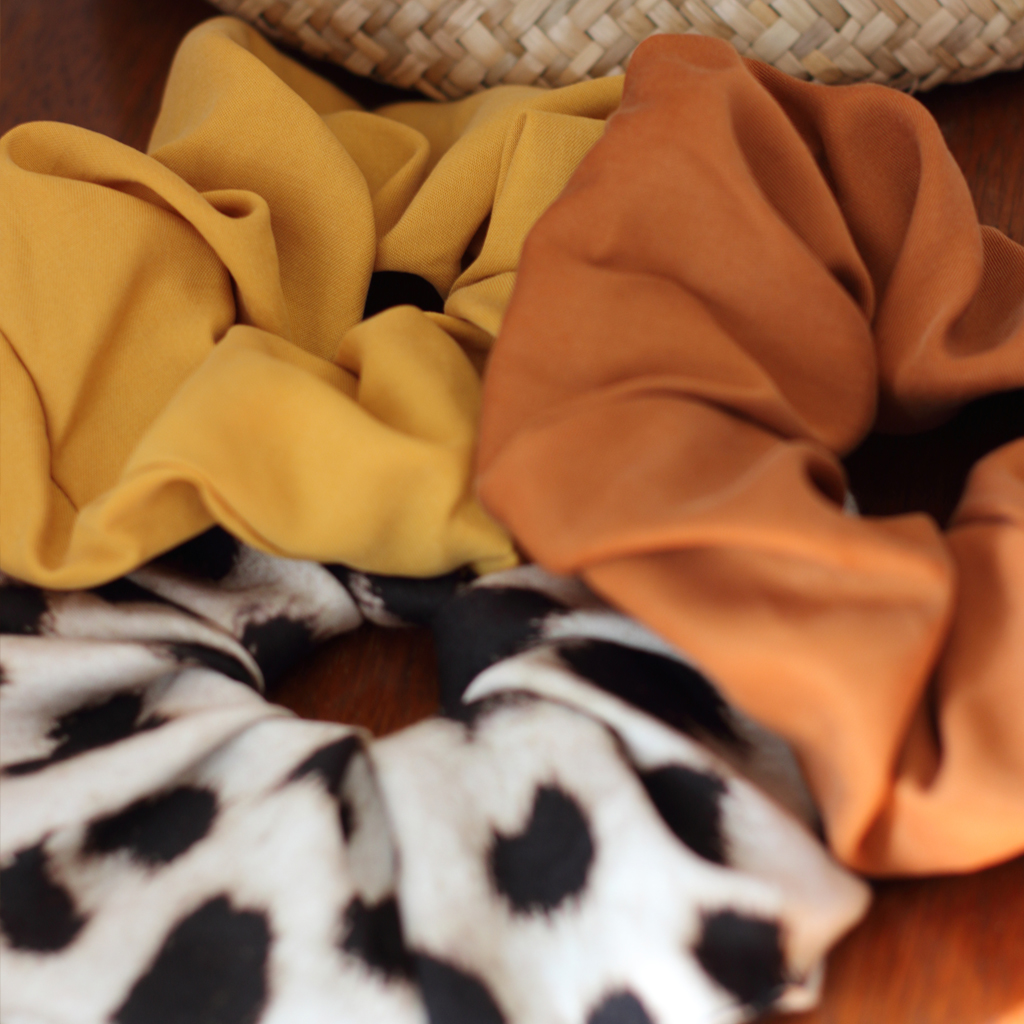 3x Scrunchies aus Tencel in Cognac/braun, Senfgelb, Leomuster