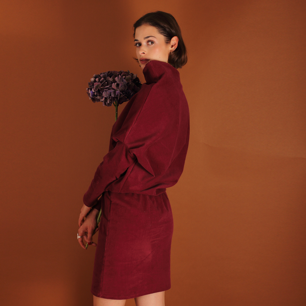 Asymmetrisches Cordkleid Juni aus Biobaumwolle kbA in berry (weinrot).