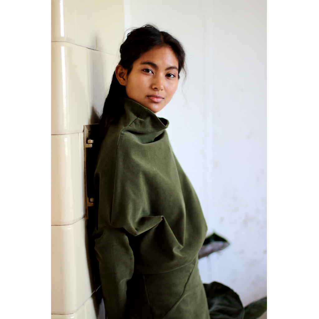 Besonderheiten: asymmetrischer Schnitt/ weiter Stehkragen