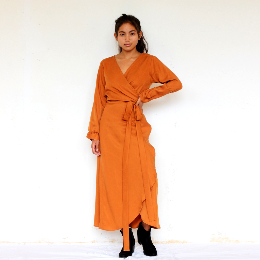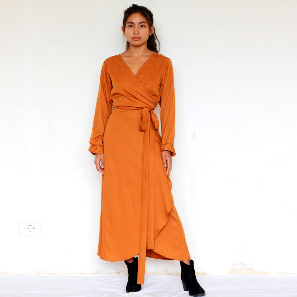Vom langärmeliges Tencel Wickelkleid Falta cognac bis zum Accessoire haben wir eine große Auswahl an eco fashion für Frauen/Diverse aus nachhaltigen Materialien wie Tencel, Bio Baumwolle, Bio Jersey, Modal und recycelten Materialien. Luftige Sommerkleider für Festlichkeiten und Hochzeiten aber auch alltagstaugliche Lieblingsstücke. In unserem Sortiment findest Du stilvolle Kleidungsstücke mit zeitlosem Design, von der moderne Culottes, gut kombinierbare Röcken, bis zu elegante Blusen und bequemen Pullovern. Besonders wichtig ist uns eine qualitativ hochwertige Verarbeitung. Und ein langlebiges aber dennoch verspieltes und stilvolles Design. Deshalb wird jedes Kleidungsstück mit viel Liebe und Sorgfalt auf Bestellung in Berlin hergestellt. So entsteht keine Überproduktion und wir schützen unseren Planeten. Wer nach styling Tipps sucht, kann uns gerne auf Instagram besuchen #mandutrap. Fakten: Fair & Sozial Unter fairen Bedingungen in Deutschland gefertigt. Made in Germany Das langärmeliges Tencel Wickelkleid Falta cognac wird wie jeder Artikel fair und in Handarbeit in unserem Berliner Atelier produziert. Vegan Keine Verwendung von tierischen Materialien. Ressourcenschonend Tencel bzw. Lyocell ist ein nachhaltiger Stoff aus Cellulosefasern, die aus Eukalyptusholz gewonnen werden. Eukalyptus kommt ohne eine künstliche Bewässerung und Düngung aus und schont somit unsere Ressourcen. Bei Biologische Baumwolle und Jersey ist der Verbrauch an Frischwasser ist um 91% geringer, außerdem werden keine Pestizide verwendet.Langärmeliges Tencel Wickelkleid Falta cognac
